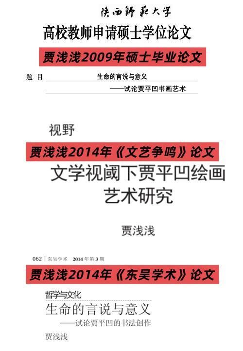 “抒情的森林”注意到,2009年,贾浅浅凭借毕业论文《生命的言说与意义——试论贾平凹书画艺术》获得陕西师范大学硕士学位; 2014年3月,已身为西安建筑科技大学中文系讲师的贾浅浅在《东吴学术》发表论文《生命的言说与意义——试论贾平凹的书法创作》(2014年6月《中国现当代文学研究》转载); 2014年7月,贾浅浅又在《文艺争鸣》发表论文《文学视阈下的贾平凹绘画艺术研究》。